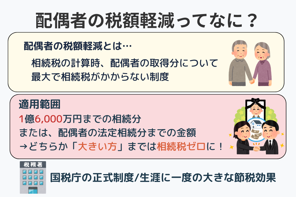 配偶者の税額軽減とは、相続の際に配偶者が取得する財産について、一定額まで相続税がかからない特例制度です。