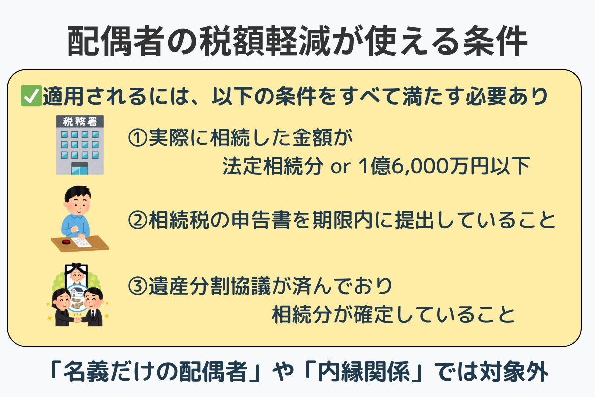 配偶者の税額軽減を受けるためには、いくつかの条件を満たしている必要があります。