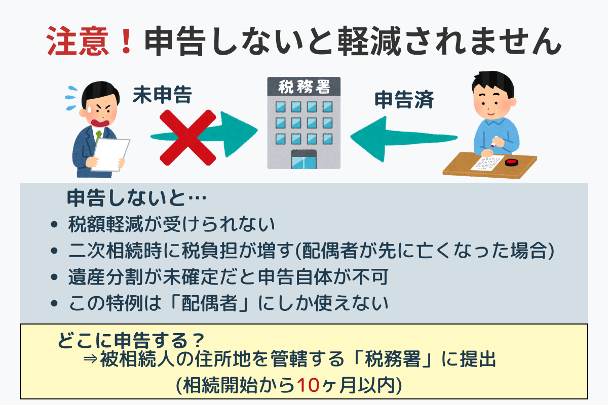申告忘れや遺産分割が未確定だった場合、適用できないので注意してくださいね。