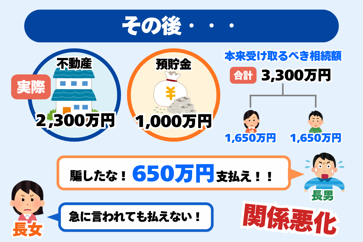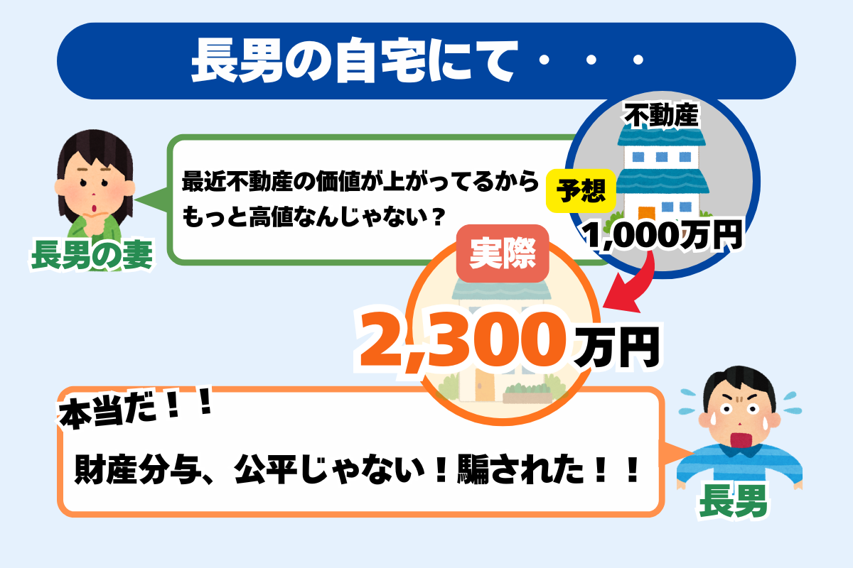 実際によくあるケースとしては、不動産の価値をよく調べず、なんとなく言われるがままに遺産をわけてしまい、後から親族間のトラブルに発展してしまうケースなどがあります。