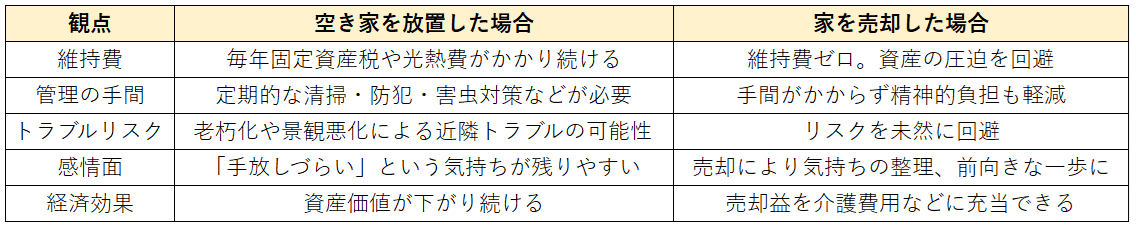 一方、売却することで経済的・精神的な負担を大きく減らすことができます。